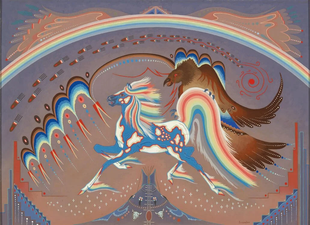Artwork? Top image is Rainbow Horse by Woodrow Wilson Crumbo. Second images is by the French illustrator Moebius. Third image is me at my backyard summer altar.